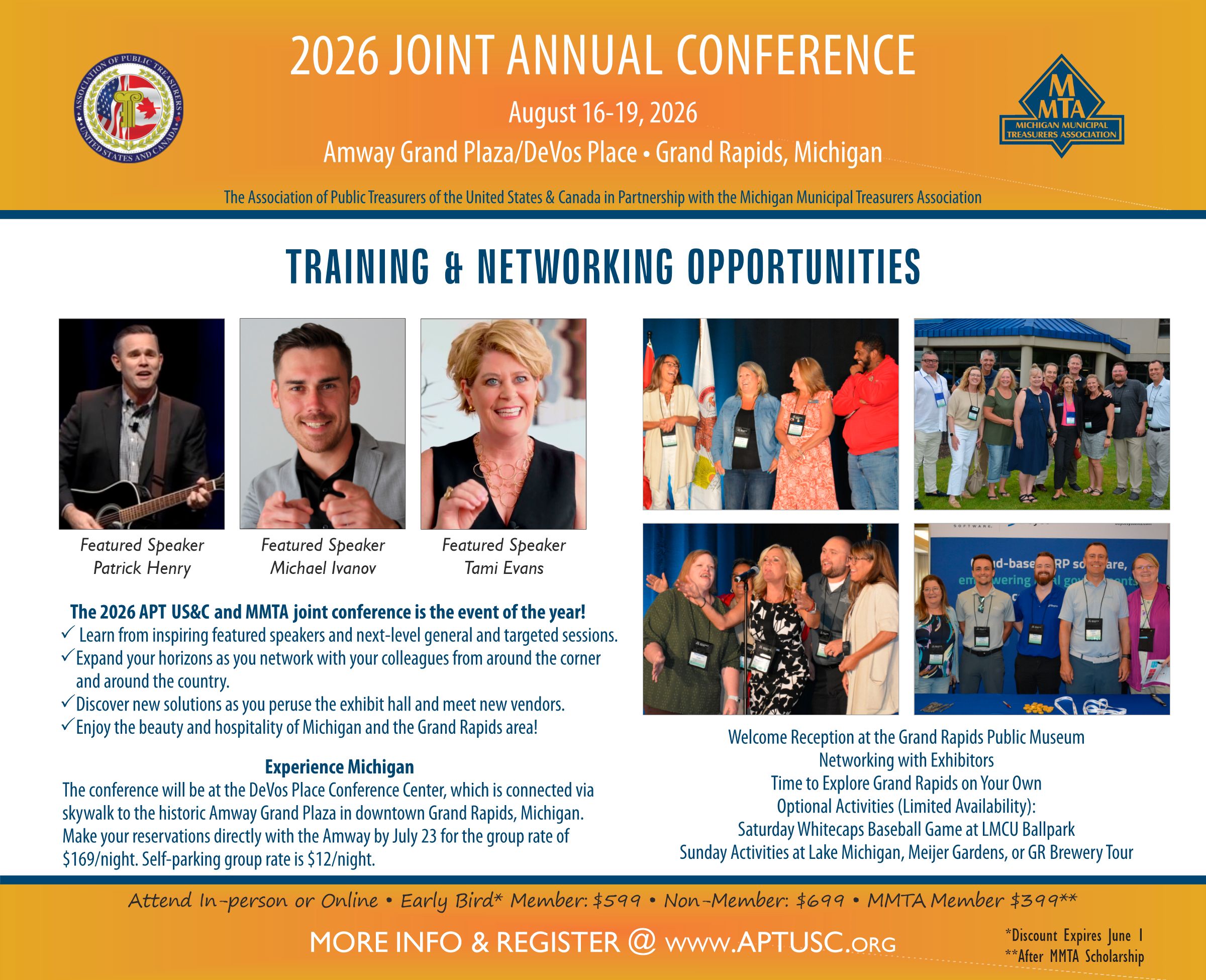 The Association of Public Treasurers of the United States & Canada (APT US&C) is proud to invite you to their 60th Annual Conference. The 2026 hybrid event will be held August 16-19 at the Amway Grand Hotel and DeVos Conference Center in Grand Rapids, Michigan.